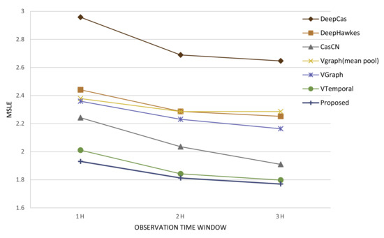 The model variant VTemporal proved the significant importance of temporal information in cascade popularity prediction task. The results were consistent with previous study [44] which only utilized temporal convolutional networks to capture the temporal information for popularity prediction of messages on social medias. Further on, as Figure 7 shows, model variant VTemporal achieved a much better prediction accuracy compared with variant VGraph, and confirmed that temporal information was a better predictor of popularity than cascade graph information. The results were consistent with the past work of Shulman [5], who proved features of early adopters were weak predictors of popularity compared to temporal features.