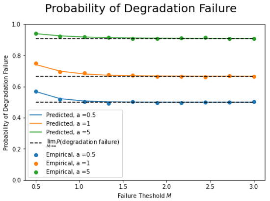 So, our system is driven by a deterministic degradation real-valued process with a constant slope a that describes the well-being of the system. Under no further assumption on the system, the process crosses a given threshold M at time . However, under random shocks occurring at random times, the crossing of M will happen at a random and possibly earlier time.