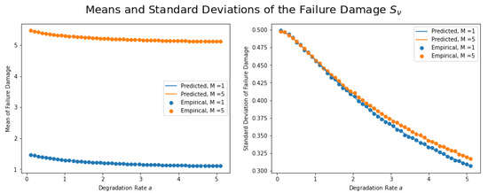 In the work of Hao et al. [23], the authors propose a mixed model under the degradation process , a linear gamma process, that is , and non-fatal and fatal shocks arrive according to a marked Poisson process of rate for its support counting measure with position independent marking, with each . A soft failure occurs when and a hard failure occurs when . Note that a stochastic process is Gamma with shape parameter and scale parameter if has independent and stationary increments and its single-dimensional pdf is . Thus, in this case, the shape parameter is linear.