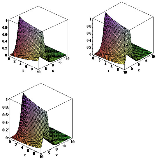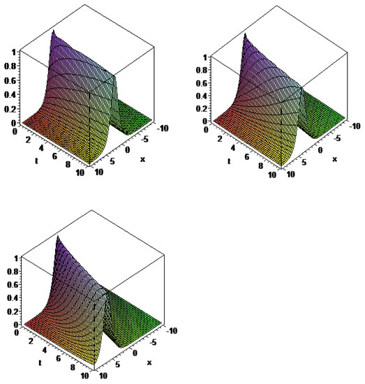 When comparing the acquired findings to the results in [38,44], it is clear that the solutions are novel. The graphs of bright soliton solutions of for = 0.25, 0.5 and 0.75 are shown in Figure 1.