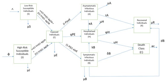 The total population size, N, is divided into eight mutually exclusive compartments; S, J, E, A, B, H, C, and R, which is interpreted as (i) low-risk susceptible individuals, (ii) high-risk susceptible individuals, (iii) exposed individuals, (iv) asymptomatic infectious individuals, (v) symptomatic infectious individuals, (vi) hospitalized individuals, (vii) death class, and (viii) recovered individuals. People with vertically transmitted or inherited disease are assumed as the high-risk susceptible individuals. Individuals in S and J can be exposed to Severe Acute Respiratory Syndrome Coronavirus 2 (SARS-CoV-2) through contact with either A or B, and we assume that the disease is faster transmitted in symptomatic infectious population than the asymptomatic infectious population, and include a variability factor . It is assumed that the transmission rate in classes S and J are the same. We also assume that individuals in H are in isolation and therefore cannot transmit the disease. We assume that new recruits enter human population by birth, immigration, or emigration at the rate . Furthermore, there is vertical transmission recruitment into class J at a rate . With contact tracing, a fraction, p, of the exposed individuals is tested for COVID-19 at a rate q and become hospitalized. A fraction of the remaining fraction of the exposed individuals who show no clinical symptoms of COVID-19 at the end of incubation period become asymptomatic at a progression rate , while the remaining fraction of the exposed individuals who show clinical symptoms at the end of incubation period becomes symptomatic at a progression rate . Fraction of low-risk and high-risk susceptible individuals who adhere to COVID-19 prevention guidelines (wearing of face masks, hand washing, and maintaining social distancing) is denoted as , while represents the expected decrease in the risk of infection due to strict and correct compliance to COVID-19 prevention guidelines by low-risk and high-risk susceptible individuals. Further, a fraction of low-risk and high-risk susceptible individuals who are on lockdown within a population is denoted as , while is the expected decrease in the risk of infection due to lock-down. The asymptomatic and symptomatic infectious individuals are hospitalized at the rates and k and recover at the rates and d. The hospitalized individuals recover at the rate but die due to COVID-19 at the rate u. The symptomatic infectious individuals also die due to COVID-19 at the rate . Dead individuals are buried at the rate a. and are the transmission rate of J and A and J and B while and are the transmission rate of S and A and S and B. We ignore the transmission route from death compartment as the likelihood of transmission when handling human remains is low [21].