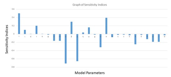 In order to know the most influential parameters concerned with the basic reproduction of the disease, sensitivity analysis is performed. We categorize the most sensitive parameters in descending order to the least sensitive ones in Table 3, after ranking the sensitivity functions. The most sensitive parameters that have positive indices on are the recruitment rate , followed by the transmission rate between low-risk/high-risk susceptible individuals and symptomatic infectious individuals , followed by the incubation rate , followed by the transmission rate between low-risk/high-risk susceptible individuals and asymptomatic infectious individuals , followed by vertically transmitted recruitment rate . From the sensitivity analysis results, we can confidently say that the intervention strategies must focus on the reduction in the above parameters in order to have a disease-free population. On the other hand, the most sensitive parameters in a negative sense is the natural death rate , followed by the fraction of the exposed individuals who are tested for COVID-19 p and become hospitalized, followed by the lockdown efficacy for low and high risk susceptible individuals m, followed by the fraction of low-risk and high-risk susceptible individuals who are on lockdown , followed by the fraction of the exposed individuals who become asymptomatic , followed by rate of testing q, followed by hospitalization rate of symptomatic k, followed by effectiveness of adherence for low-risk and high-risk susceptible individuals g, followed by the recovery rate of symptomatic individuals d, followed by the fraction of low-risk and high-risk susceptible individuals who adhere to prevention guidelines , followed by hospitalization rate of asymptomatic infectious individuals , followed by COVID-19-caused death rate , followed by recovery rate of asymptomatic infectious individuals . It is clear to see that a fraction p, of the exposed individuals who are tested for COVID-19 at a rate q, and become hospitalized, has significant contribution to the disease dynamics. Therefore, high level of contact tracing through testing and hospitalization of the exposed individuals who are tested for COVID-19, are needed at the beginning of the epidemic. The sensitivity indices of the model (9)–(12) are graphically shown in Figure 2.