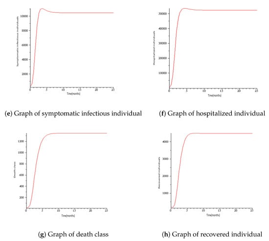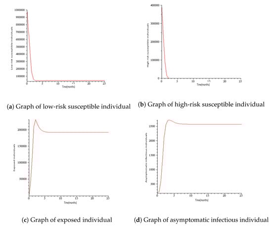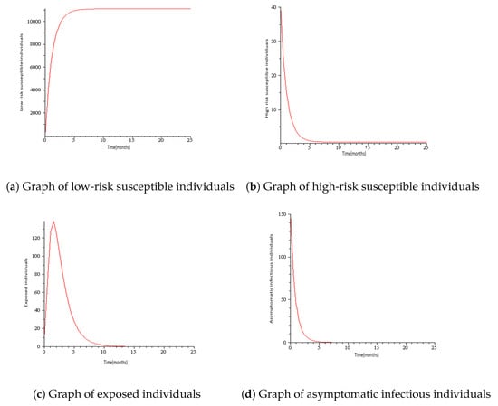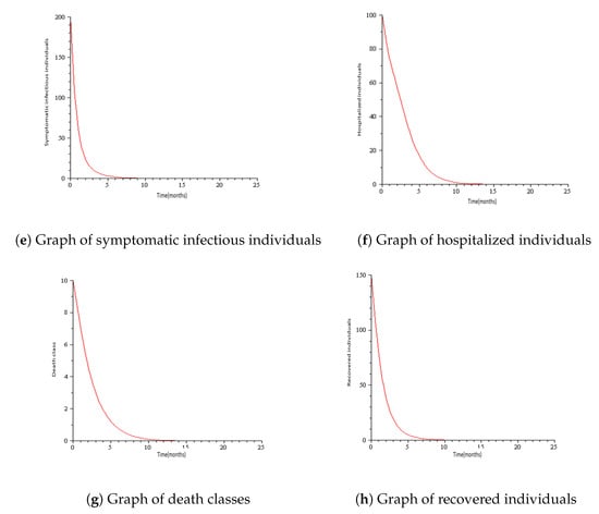 Therefore, for and if and only if or , and . Consequently, the largest invariant set in is the singleton and by LaSalle’s Invariance Principle [27], is globally asymptotically stable. The epidemiological implication of the above result is that COVID-19 can be eradicated from the population when irrespective of the initial sizes of the sub-population of the model. □