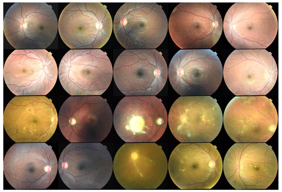 The image dataset used in this paper is composed of 20 RGB fundus photographs, 10 from healthy patients and 10 from ill patients with retinopathy. Figure 1 shows the complete image dataset, where each image has a spatial resolution of pixels with 24 bits per pixel. The first two rows in Figure 1 correspond to healthy patients and the last two rows to non-healthy patients. In each original image, firstly, we scanning the rows and columns to delimited an ROI (Region of Interest) containing the area closer to the eyeball, removing a large area of black pixels around it. At present, the dataset is not publicly available.