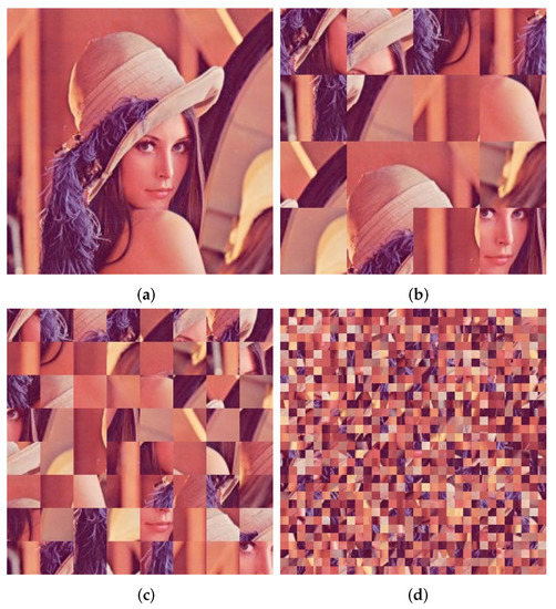 Figure 2 shows a RGB image (Lena image) and the Jigsaw transform result for , generating resulting non-overlapping subsections of , , and pixels respectively.