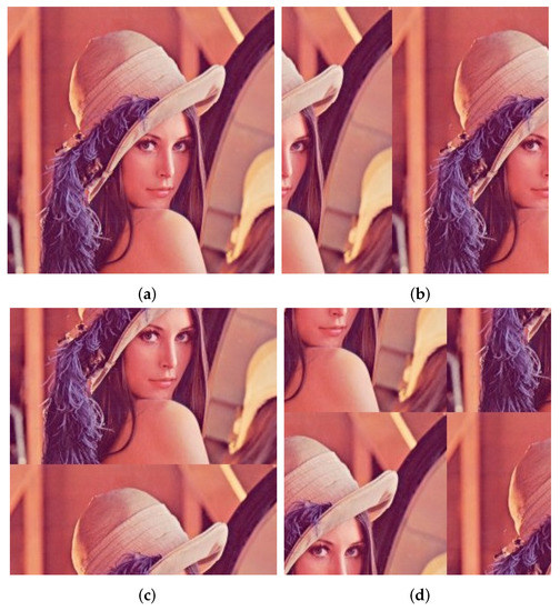 Examples of a cyclic permutation over the Lena image. (a) RGB image of Lena. (b) Left horizontal cyclic permutation result. (c) Vertical upward cyclic permutation result. (d) Left cyclic permutation followed by a upward cyclic permutation applied.