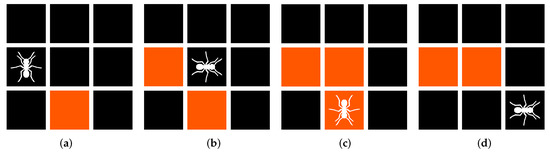 Langton’s ant is a 2D universal Turing machine with two main characteristics: (i) a simple set of rules and (ii) a complex emergent behavior. Langton’s ant consists of an infinite grid of cells, which have two states: ON and OFF. An imaginary ant is placed in one of the cells, which will walk through the grid following two rules: (i) if it is in a cell turned OFF, it will rotate 90 degrees clockwise, turn ON the cell and move to the cell in front of it. (ii) On the other hand, if it is in a cell that is turned ON, it will rotate 90 degrees counterclockwise, turn OFF the cell, and move to the cell in front of it. The first four steps of an ant following these rules is shown in Figure 4.