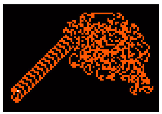 Initially, the ant’s behavior seems chaotic, but eventually the ant stabilizes in a 104-step pattern called “the highway” that will continue indefinitely unless there is a turned ON cell in its path as shown in Figure 5. This behavior appears when the ant is placed on the all-white vertices, so the ant stays in an area of 45 × 48 by around 10,000 steps, and unpredictably it starts dancing a highway of 104 steps. In the highway pattern, the ant moves diagonally with a speed of 2/52. For years this phenomenon has taken place with no exception, generating the highway conjecture: “By starting from any initial configuration with finite support, the highway must eventually appear” [53].