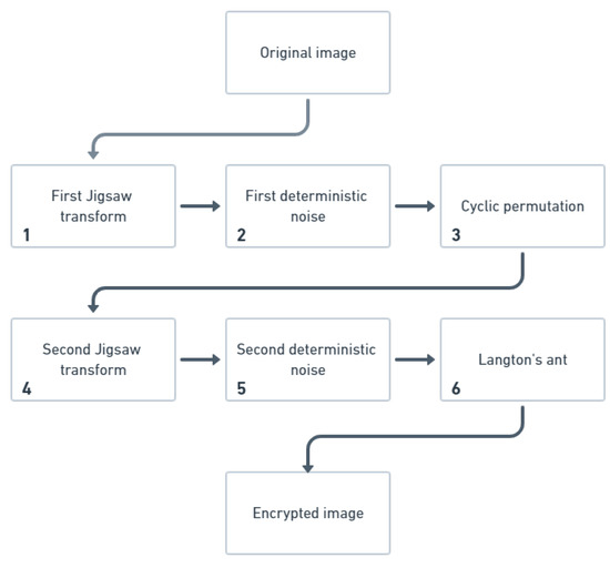 Our encryption algorithm uses the previously defined algorithms of the Jigsaw transform, cyclic permutation, Langton’s ant and deterministic noise. It can be divided into six steps, as illustrated in Figure 10. The first step is to use the Jigsaw transform (Section 2.2) to scramble the image and hide its visual information. The second step is to add the deterministic noise defined in Section 2.5, hiding most of the histogram of the image. The parameters used to add this noise will be determined by the picture as it will be detailed later. This noise leaves some sections of the image almost unaltered, which could give slight hints of the original colors of the picture. That is why it is needed to re-scramble the image to add more noise. The third step then is to use cyclic permutation, described in Section 2.3, on the image; and the fourth is to use another Jigsaw transform as a consequence of using the cyclic permutation we scramble a different set of pixel blocks in this second Jigsaw transform. The fifth step is to add more deterministic noise (using now parameters given by the user). Finally, the sixth step is to use Langton’s ant (Section 2.4).