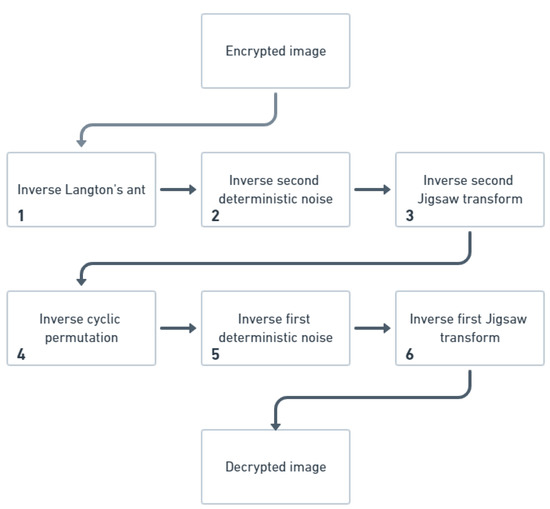The decryption algorithm uses the inverse function of all the algorithms used for encrypting as illustrated in Figure 11. First, we use the final coordinates and orientations of all the ants from step 6 and we apply Langton’s ant to all the sections of the image using those parameters with the ant rotated 180 degrees before. Next, we use the inverse of the deterministic noise using the same parameters that were used for adding the noise. We then perform the inverse of the Jigsaw transform of step 4, the inverse of the cyclic permutation of step 3, the inverse of the deterministic noise of step 2, and finally the inverse of the Jigsaw transform of step 1.