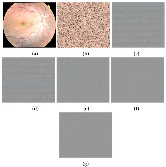 Results of the encryption algorithm applied to image 6 from the healthy patients. (a) Original image. (b) First step: Jigsaw transform. (c) Second step: deterministic noise. (d) Third step: cyclic permutation. (e) Fourth step: Jigsaw transform. (f) Fifth step: deterministic noise. (g) Sixth step: Langton’s ant.