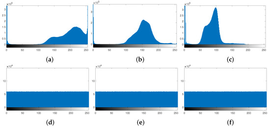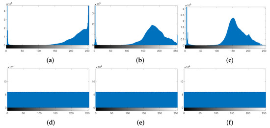 Histograms of image number 6 (healthy patient). (a) Original image, red channel. (b) Original image, green channel. (c) Original image, blue channel. (d) Encrypted image, red channel. (e) Encrypted image, green channel. (f) Encrypted image, blue channel.