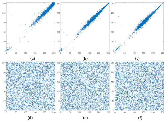 Correlation distributions of image number 6 (healthy patient). (a) Original image, red channel. (b) Original image, green channel. (c) Original image, blue channel. (d) Encrypted image, red channel. (e) Encrypted image, green channel. (f) Encrypted image, blue channel.