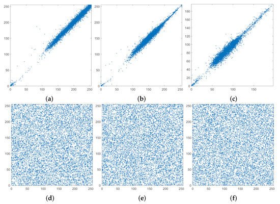 Correlation distributions of image number 15 (sick patient). (a) Original image, red channel. (b) Original image, green channel. (c) Original image, blue channel. (d) Encrypted image, red channel. (e) Encrypted image, green channel. (f) Encrypted image, blue channel.