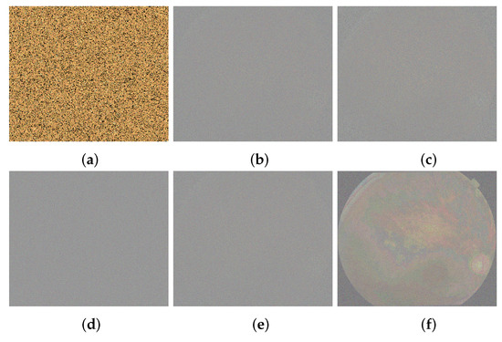 In this section, we show some results of the proposed encryption scheme. For this, we encrypted 2 images, image number 6 from the healthy patients and image number 15 from the sick subset. We used subsections of for the Jigsaw transform, a cyclic permutation of 2005 columns and 2007 rows, sections for Langton’s ant (placing the ants of the red channels on the first row and second column, the ants of the green channels on the second row and second column, and the ants of the blue channels on the third row and second column) and as the parameters for the second deterministic noise. The results obtained are shown in Figure 12 and Figure 13, respectively.