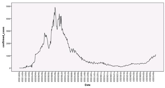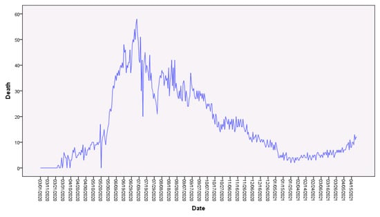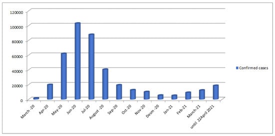 The most recent statistics about the COVID-19 pandemic and the total number of affirmed cases and deaths in the territory of Saudi Arabia for the period from 1 March 2020 to 22 April 2021 are displayed in Figure 1 and Figure 2. The numbers likewise express that there is a fast and ceaseless expansion in the number of new cases, particularly in the months of May, June, July, and August 2020. The affirmed cases that came to notice during these four months were in excess of 293,419 cases, an average of 0.72 of the all affirmed cases till the end of our study, which added up to 408,078 cases, and there were 3713 deaths—rates of 0.54 from the entire death number. We have seen that it is on the ascent, as the affirmed cases expanded from 1563 in March with an average of 50 cases in a day, then, at that point expanded during April to reach 19,839 with an average of 661 cases. Nonetheless, the number of affirmed cases during May came to 61,982, with an average of 2000 cases. Then, at that point, the quantity of the affirmed cases expanded to reach 103,052 cases toward the end of June with an average of 3435 cases. We additionally saw that during June the cases expanded quickly, which is a much more noteworthy number than the cases during the period 1 March 2020 until 30 May 2020.