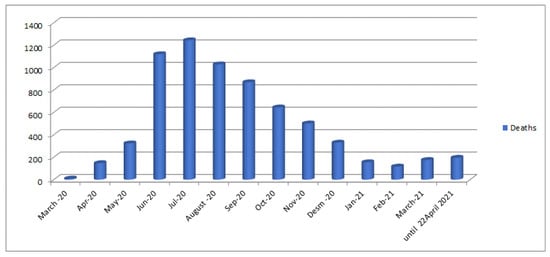 On the other hand, there has been an increase in the number of deaths from this virus, as nine deaths were recorded for the month of March 2020, then it reached 1243 during the month of July 2020, and then decreased from the months August to December 2020. In 2021, deaths were recorded during January 155, then decreased during February, and then increased during March and April. Table 1 and Figure 3 and Figure 4 illustrate that.