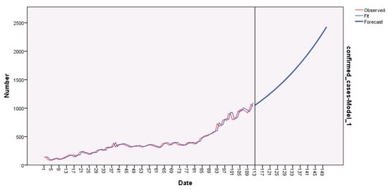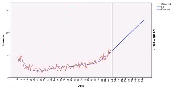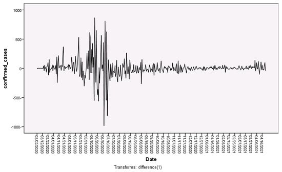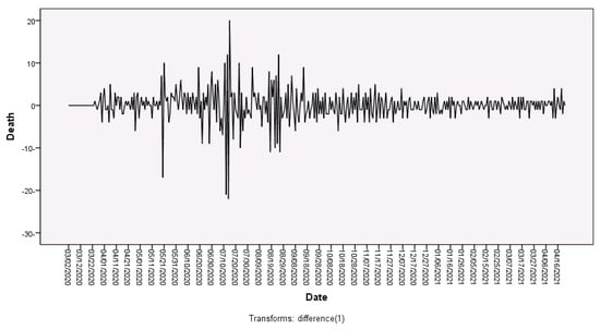 Time series models play a critical role in predicting the actions of phenomena and variables over time and their impact climate science, economics, finance, epidemiology, health engineering, and other different sciences. Many researchers have lately used it to model and forecast future trends in the behavior of many diseases and epidemics. Most of these models include a procedure of four essential steps: initially, identifying the model, secondly, estimating anonymous parameters, thirdly, diagnosis and finally, forecast [29,30,31,32,33]. There are numerous kinds of models for time series that are fitting in predicting, for example, AR, MA, ARMA, ARIMA, ARCH, GARCH. In this manner, the nature and trial of the information for the two series under examination and every one of the hypotheses connected to them (and the consistency of the time series) were confirmed to be utilized in the forecast process. In this regard, there are many transformations that must be used to convert the original data of the non-stationary time series into a stationary time series to be used in the prediction process, such as natural log and differences of the first and second degree. Here, we processed the original data then took the first differences for two series to remove the effect of the general trend, and both series become stable, in order for the model to be valid for predicting deaths and confirmed cases, as in Figure 5 and Figure 6. So they can be utilized in the expectation process. The statistical analysis software (SPSS) version 23 and the Expert Modeler Procedure were utilized to predict new everyday affirmed cases and deaths at a certainty span (95%) for COVID-19 in Saudi Arabia for the period from 22 April 2021 to 31 May 2021 as in Figure 7 and Figure 8 and Table 5.