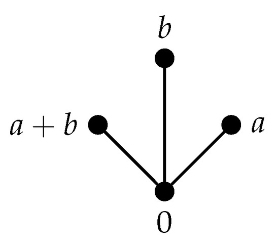 By Corollary 2(a), we have . Therefore, , and hence . Therefore, and so R is isomorphic to or . Hence, is a triangle (as shown in Figure 1; note that and are isomorphic).