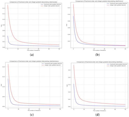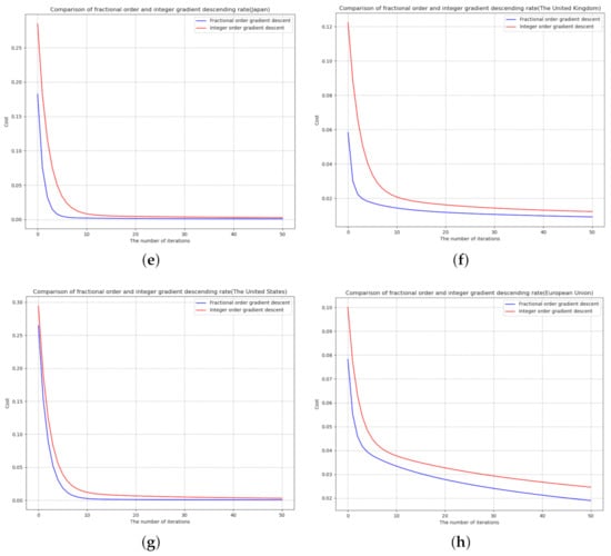 Comparison of convergence rate and fitting error between fractional- and integer-order gradient descent: (a) Canada (b) France (c) Germany (d) Italy (e) Japan (f) The United Kingdom (g) The United States (h) European Union.