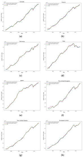 Fitting of GDP of the G7 countries by fractional-order gradient descent method: (a) Canada (b) France (c) Germany (d) Italy (e) Japan (f) The United Kingdom (g) The United States (h) European Union.