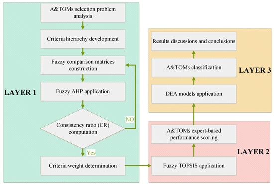 From different methodologies used in previous studies, it can be seen that AHP, TOPSIS, and DEA methods are the three most prominent and used in different research fields due to their versatility form of their application. AHP is one of the effective mathematical weighting methods to determine the rank of dissimilar attributes with respect to the target. TOPSIS method is one of the widely used MCDM methods in research. To strengthen the solutions by combining the advantages of the above three methods with fuzzy theory, this study proposes a three-layer approach structured with FAHP, FTOPSIS, and DEA models for the A&TOM selection problems.