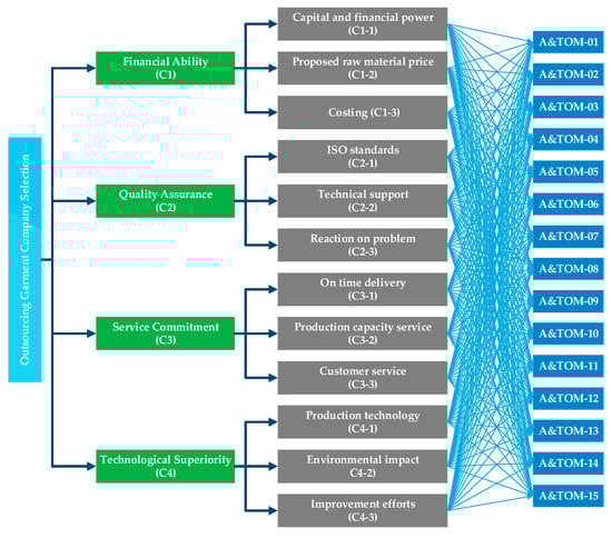 In this study, the proposed fuzzy MCDM model supports to analyze the effectiveness of A&TOMs. Accordingly, the top fifteen A&TOMs in terms of market value were selected for this numerical analysis. Based on literature reviews along with expert survey results, the hierarchy of criteria and sub-criteria for the analysis is depicted in Figure 3. In particular, the criteria showing the capabilities of A&TOMs include financial ability, quality assurance, service commitment, and technological superiority. Twenty experts, with over ten years of experience, consulted and effectively assessed the impact of the criteria and scored the A&TOMs on each sub-criterion in the linguistics levels as Table 4. These professionals are heads of relevant departments from various segments of the garment supply chain.