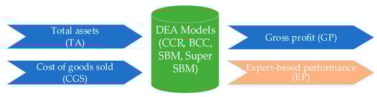The principal objective of DEA models is to measure the efficiency of using multiple inputs and outputs. From the diverse blend of factors utilized in earlier studies as shown in Table 5, this study selected cost of goods sold (CGS), total assets (TA) as an inputs factor, while gross profit (GP) and expert-based performance (EP) are the outputs.
