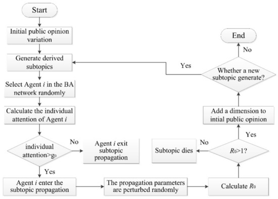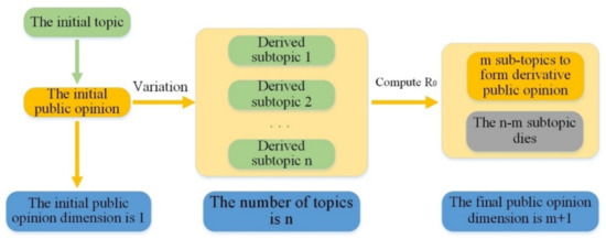 It can be seen from Figure 5 that when a derived subtopic is generated, the attention of an individual in the network to the subtopic is calculated at that moment. If it is greater than the attention threshold, the individual participates in the discussion of the subtopic. At the same time, the propagation parameters of the subtopic change, and the basic regeneration number also changes accordingly. When the basic reproduction number R0 > 1, it is considered that the subtopic forms a derived public opinion. When multiple derived subtopics form a derived public opinion, this and the initial public opinion form a multi-dimensional public opinion.