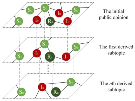 It can be seen from Figure 4 that the spread of initial public opinion corresponds to the first-level SIR communication network. After the first derived subtopic is generated, individuals in the network choose whether to participate in the discussion of the first derived subtopic according to their degree of attention. A second-layer SIR propagation network emerges, and the process goes on until n subtopics are derived, when an (n + 1)-layer SIR propagation network is formed, corresponding to the propagation process of (n + 1) topics.