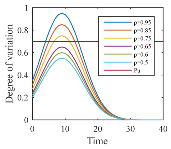 where T represents the evolution time of public opinion, ρ is the degree of information alienation, δ is the environmental forces, and the degree of variation P first increases and then decreases with the development of public opinion. Generally, a deeper degree of information alienation means a higher degree of variation, a greater environmental force, and a higher degree of variation.