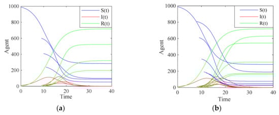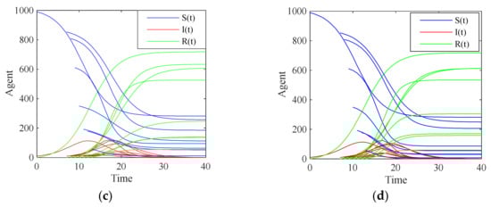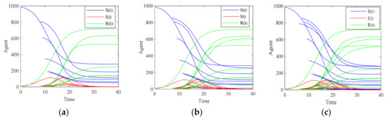 It can be seen from Figure 9 that the blue, red, and green lines represent the number of agents who are susceptible, infective, and recovered, respectively. Comparing the curve of the number of susceptible persons and the number of infective persons with respect to the initial public opinion and the subtopics in Figure 9, it can be seen that although the initial number of susceptible agents discussing subtopics is less than the number of those discussing the initial topics, the number of infective agents discussing some subtopics is the same as that discussing the initial topics. This indicates that the popularity is the same as the initial public opinion. With the deepening of information alienation, the number of such subtopics further increases.