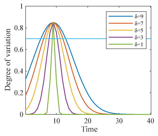 When the information of the initial public opinion is varied, the degree of variation is higher and the degree of variation of the initial public opinion is greater. When the degree of variation reaches the threshold, derived subtopics are generated, and the longer the duration of the high variation state is, the more times the degree of variation reaches the threshold and the number of subtopics also increases. Based on this, this section will simulate and analyze the changes of variation under different information alienation settings. The results are shown in Figure 6 and Figure 7.