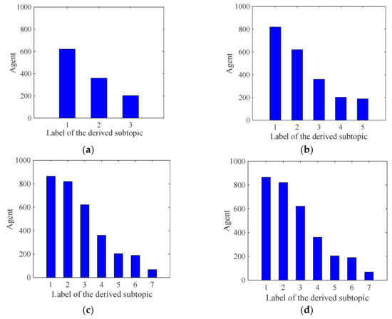 It can be seen from Figure 32a that the number of agents associated with the first, fourth, and seventh derived subtopics is relatively large, which means that participation is high. It can be seen from Figure 32b that the dimensions of public opinion began to rise on November 21, reached a peak on the 29th, and finally stabilized at six dimensions, and formed a six-dimensional public opinion. This six-dimensional public opinion is the original public opinion.