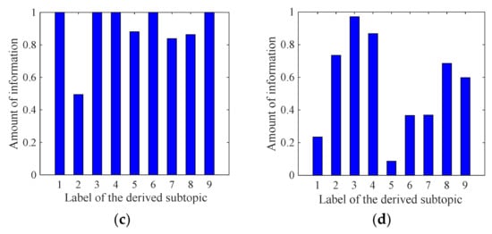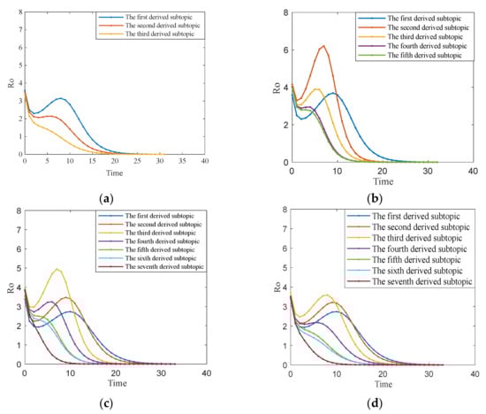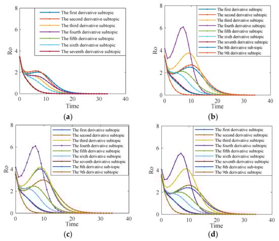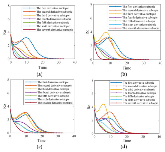 It can be seen from Figure 10 that the changes in the basic reproduction numbers of each derived subtopic under different information alienation settings shows two trends: one is a short-term decline in the initial stage, then a rise to a peak, and finally a decline and stabilization at 0; the other is a gradual or slow decrease and final stabilization at zero. This shows that after the emergence of subtopics, there has not yet been a large-scale discussion in the initial stage, so the basic reproduction number declines. With the increase of netizens’ participation in discussions, some subtopics may become hot topics due to the large amount of information or the influence of factors such as the network environment. Therefore, the basic reproduction number rapidly increases. At the same time, some subtopics may disappear as the initial basic reproduction number declines. In addition, with the increase of the degree of information alienation, the explosive growth of the basic reproduction number of the first derived subtopic becomes weaker and weaker. This shows that when the degree of information alienation is high, the earliest derived subtopics may not necessarily become explosive hot topics, but the derived subtopics generated in the middle and later stages are more likely to become hot topics.