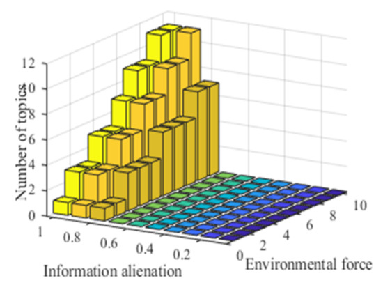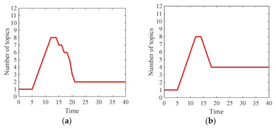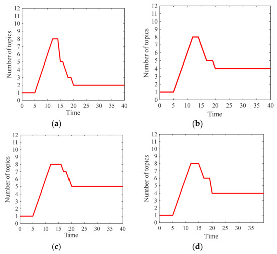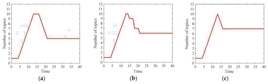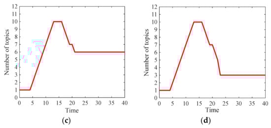 In addition, it can be seen from Figure 11 that the number of topics are all 1 in the initial state. From time = 5, derived subtopics are successively generated, and the number of topics also rapidly increases. With further propagation, some subtopics disappeared, and the number of topics also gradually decreases. In the end, some derived subtopics form derived public opinion, and the dimensions of multi-dimensional public opinion also stabilize at a certain value. Comparing Figure 10a–c, it can be seen that as the degree of information alienation increases, the number of topics starts to rise earlier, and as the number of subtopics increases, the peak of the number of topics rises from six to ten. The increase is large, but the final dimensions of the stable state has changed slightly, rising from two to four, which shows that the degree of information alienation has an impact on the number of derived subtopics, but it has a greater impact on the final public opinion dimension. The degree of influence is relatively small.