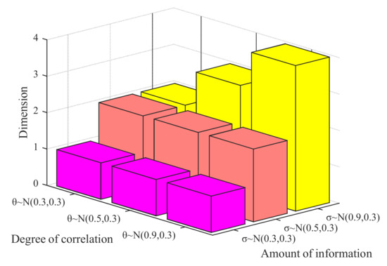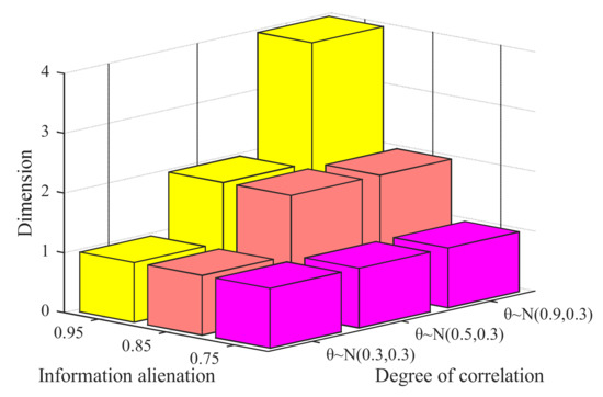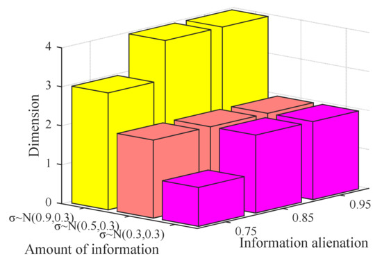 Figure 25, Figure 26 and Figure 27 respectively show the relationship among degree of correlation, amount of information, and dimension, the relationship among degree of correlation, information alienation and dimension, the relationship among amount of information, information alienation and dimension. It can be seen from Figure 25 that when the amount of information contained in a subtopic is small, its correlation does not impact on the dimension. When the amount of information contained is large, as the correlation increases, the dimension increases. No matter how the degree of correlation changes, the dimensions of public opinion increase when the amount of information increases. Therefore, comparing the effect of correlation, the amount of information contained in subtopics has a greater impact on the dimension. It can be seen from Figure 26 that with the increase in the degree of correlation and information alienation, the dimension increases, and the increase in the two is not much different. It can be seen from this that: the degree of correlation and the degree of information alienation have little effect on the dimensions of public opinion. It can be seen from Figure 27 that as the degree of information alienation and the amount of information contained in subtopics increase, the dimensions of public opinion increase to a certain extent. When the amount of information is σ~N(0.5, 0.3), as the degree of information alienation increases, the dimensions of public opinion do not change. When the degree of information alienation increases with the amount of information contained in the subtopics, the dimensions of public opinion change. It can be seen that, compared to the degree of information alienation, the amount of information contained in subtopics has a greater impact on the dimensions of public opinion.