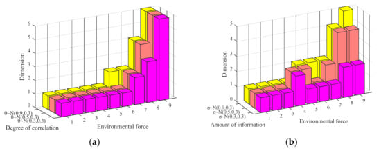 Combination analysis of environmental forces, correlation and the amount of information contained in subtopics. (a) The relationship among dimension, environmental forces and correlation. (b) The relationship among dimension, environmental forces and amount of information.