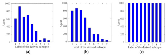 The number of agents participating in subtopic communication under different information alienation. (a) = 0.75. (b) = 0.85. (c) = 0.95.