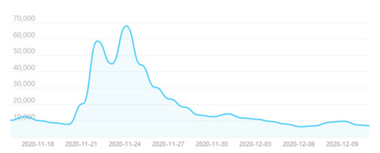 The news of COVID-19 that broke out in late 2019 swept across China and the world. At the same time, hot events related to the epidemic are fermenting on the Internet, and the spread of some rumors has caused many netizens to panic. After a long period of anti-epidemic work, the epidemic situation in China has basically stabilized and people’s lives have gradually returned to normal. However, on 9 November 2020, China’s CCTV news broadcast “One new local confirmed case of COVID-19 in Shanghai” ignited netizens’ panic. With the development of the Shanghai epidemic, the incident has spawned many topics, and even the discussion on the derived topics has surpassed that of the original topics. The original topic of “One new local confirmed case of COVID-19 in Shanghai” derived further subtopics, such as “Shanghai Epidemic Prevention and Control Work Conference”, “One Community in Pudong New Area will be Upgraded to Medium Risk Degree”, and “4015 people in Shanghai Pudong Hospital have been quarantined”. Discussions on these derived subtopics have even pushed the public’s panic to a climax. Here, we searched the Baidu index with “Shanghai epidemic” as the key word and obtained the search index from 18 November to 9 December 2020, as shown in Figure 31.