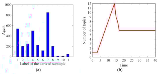 Simulation of derived subtopics for this public opinion used the model proposed in this paper. (a) The number of agents discussing derived subtopics. (b) Change in the number of topics.