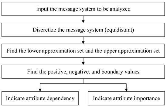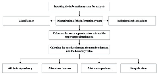 Therefore, we know that γc(D) represents the dependency between decisional attribute D and conditional attribute C. In other words, C can be used to describe the degree of approximation of . Therefore, the importance of the attribute can be measured by the change in value γc(D) when is removed from C. These analytical steps are shown in Figure 2 [25].