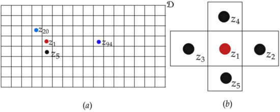 - Area or lattice data: This is a simple way to represent spatial data in the domain . In this type of spatial domain, is a random aggregated realization across an area s of distinct boundaries. For area data, the boundaries are irregular, such as administrative divisions, whereas for the lattice, the boundaries are a regular division of . For simplicity, it may be necessary to aggregate other types of spatial domain realizations to form area or lattice data. This process may sometimes be referred to as a discretization of ;