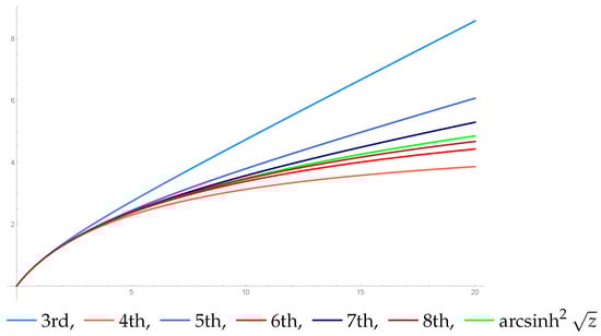 Plots of the values of the nth approximants of the branched continued fraction (53) for are shown in Figure 3.