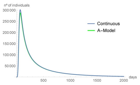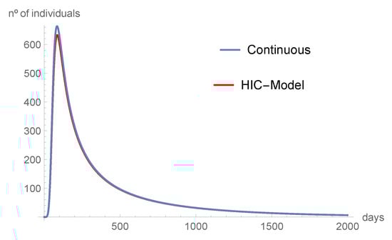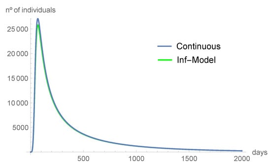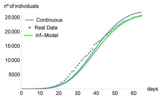 Using the values of Table 2, in Figure 1, we compare the number of infected individuals predicted by our discrete-time model, the ones predicted by the continuous model of [], and the real data.