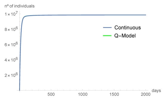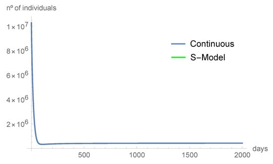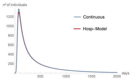 Figure 2 shows the consistency of our result. We compare the predictions from the continuous model with the predictions from the discrete-time model. Using the parameter values of Table 2, , the number of infected and asymptomatic individuals, as well as the ones in the hospital and intensive care units, tend to disappear. The susceptible individuals and those in quarantine tend to the equilibrium point as time increases.