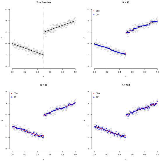 The remaining options are set to the same value and then are simulated. As shown in Figure 1, we confirm that both algorithms yield the same results. However, when the number of knots (K) increases, the CDA does not converge appropriately to the minimum under a limited iteration number (M) and the stopping criterion (), unlike QP. Hence, we performe the next simulation using only QP. It is noteworthy that a higher number K of interior knots indicates a higher probability of overfitting.