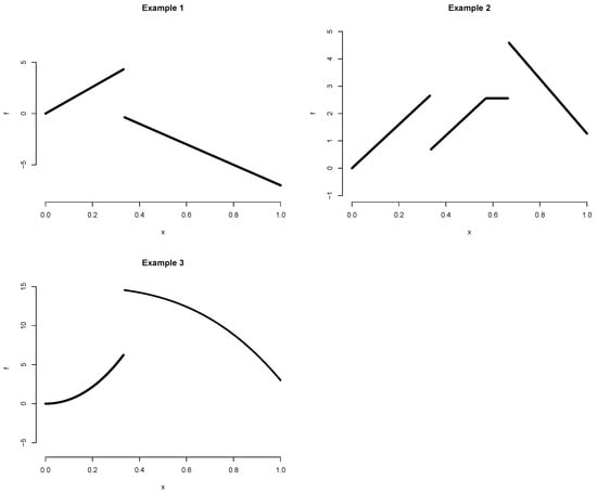 In Examples 1–2, a linear model with the jump(s) is considered. In Example 1, the true knot is 0.333, whereas they are 0.333 and 0.666 in Example 2. Example 3 is designed as a nonlinear function, where the true function is of quadratic and cubic form. Figure 2 shows the true functions of Examples 1–3.