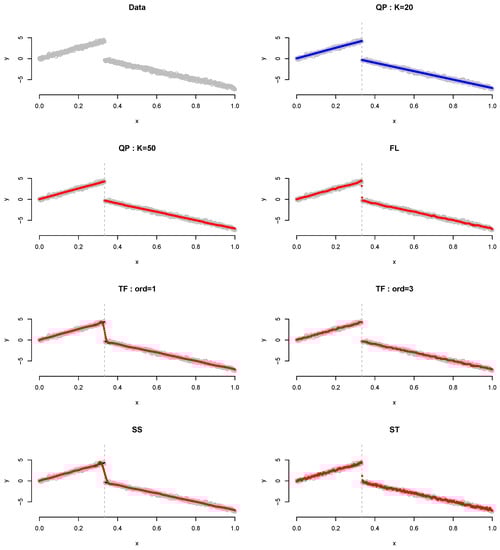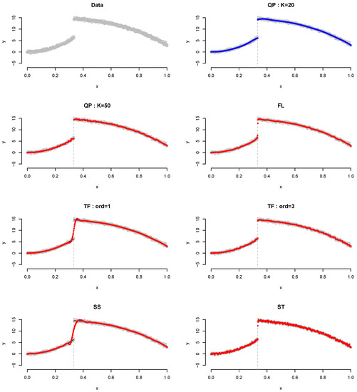 As shown in Table 1, because QP not only can detect change points (or jumps), but can also fit piecewise polynomial regression, it demonstrates the best performance compared with the other methods. Comparing the QP results based on K, it is discovered that the best performance is obtained when . Figure 3 shows the plot for the results of Example 1 when . QP detects the change point and fits the linear regression accurately, particularly when . Although the performances of FL and TF with order 1 improve in general as the sample size n increases, it cannot detect the change point. Herein, “cannot detect the change point” means that, around the true knot, the plot has point(s) alone or successive.