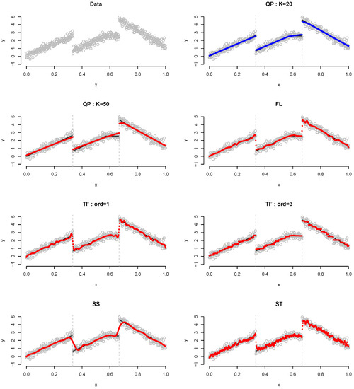 We compare the proposed method with the fused lasso (FL) of Tibshirani et al. [17], the trend filtering (TF) of Kim et al. [25], the smoothing spline (SS) of Kim and Gu [26] and a fitting method for the structural model for a time series (ST) by Harvey [27].